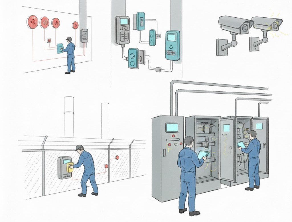 - Фокус работ: проверка шлейфов и линий связи, тестирование извещателей (точечных, линейных, адресных), проверка ППКП, резервного питания, сценариев СОУЭ, журналов событий.