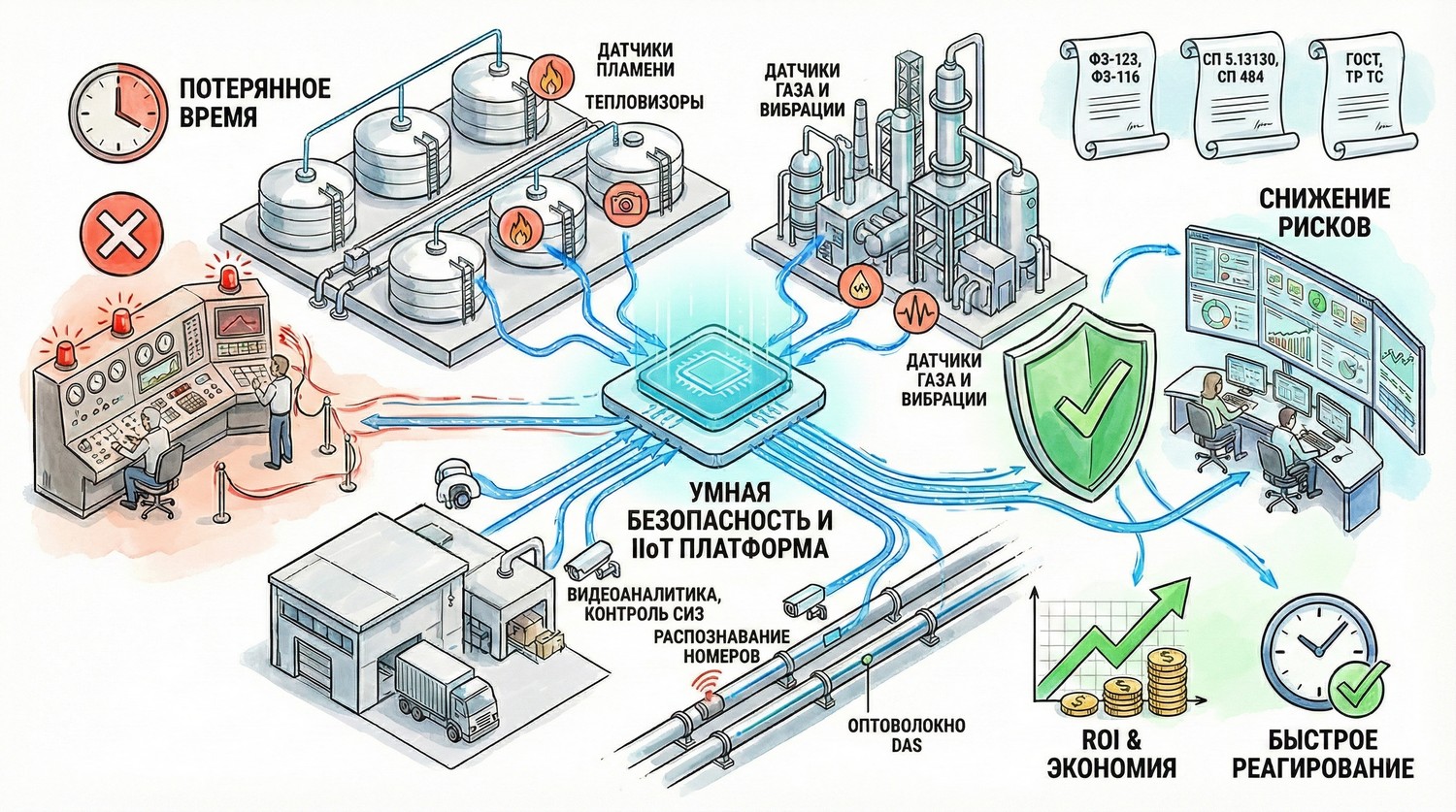 Критически важно, что smart‑подход не противоречит базе: он дополняет требования ФЗ-123 «Технический регламент о требованиях пожарной безопасности», ФЗ-116 «О промышленной безопасности ОПО», ФЗ-16 «О транспортной безопасности», ФЗ-35 «О противодействии терроризму», СП 5.13130, ГОСТ Р 53325, СП 484.1311500, ГОСТ Р 51558. При проектировании учитываются также ТР ТС 012/2011 (взрывозащищенное исполнение), ГОСТ 12.1.004-91 (общие требования пожарной безопасности) и 152-ФЗ (персональные данные) для видео/RTLS.