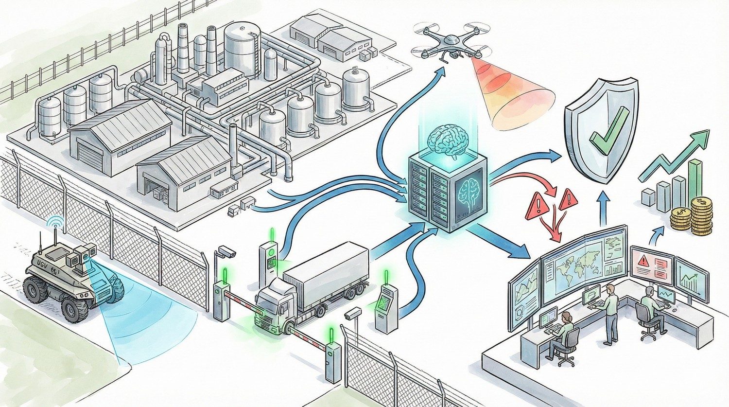 | Роботы-патрули (UGV) | Маршруты, тепловой контроль, верификация тревог | CAPEX: средний; OPEX: низкий | -30–50% ложных тревог, -1–2 поста обходов |