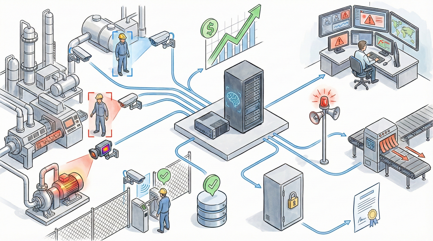 Edge-аналитика на камерах: каска/жилет, присутствие в опасной зоне при включенном агрегате. Снижение инцидентов “человек в опасной зоне” на 80% за 4 месяца. ROI — 14 месяцев за счет снижения простоев и штрафных рисков.