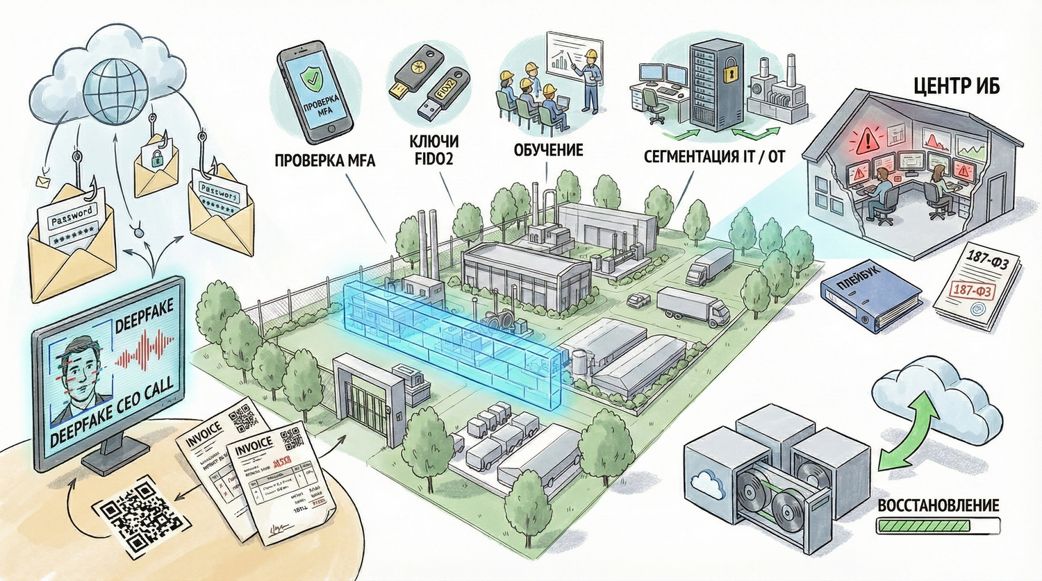 В промышленности фишинг опасен тем, что атакующий часто стремится не к мгновенной выгоде, а к “тихому” закреплению, чтобы затем перейти к АСУ ТП через смежные IT‑системы. Без сегментации и строгой модели доступа риск эскалации высок.