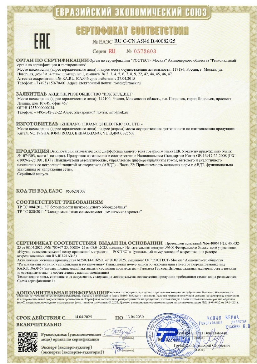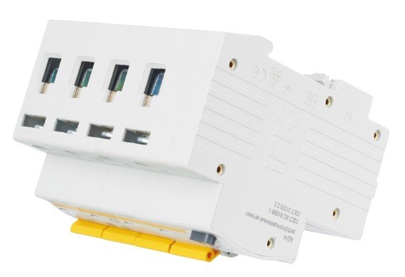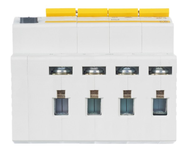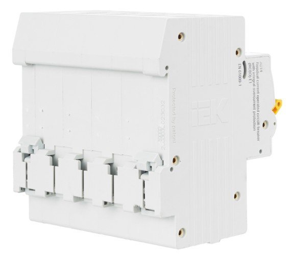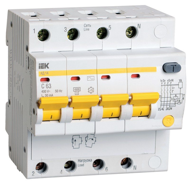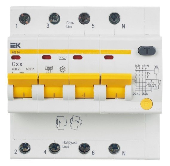 Автоматический выключатель дифференциального тока. Модульный автоматический выключатель дифференциального ток на DIN-рейку, 4-полюсный, дифференциальный ток 30 мА, номинальный ток 50 А, тип срабатывания по дифференциальному току AC, степень защиты IP20, независимый индикатор положения контактов, рабочая температура -25 + 40°C