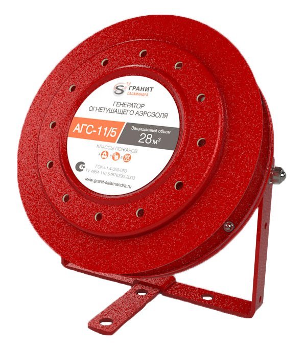 Выход аэрозоля по периметру 360°. АГС-11/5 представляет собой невысокий металлический корпус цилиндрической формы, на боковой поверхности которого по периметру находится сопловая щель. При своих малых габаритах генератор обеспечивает существенный защищаемый объем - до 28,0 м3.За счёт изменения конструкции системы значительно уменьшена массовая доля конденсированной фазы и снижена температура корпуса генератора. Имеет большое количество модификаций по типу крепления и направлению газо-аэрозольной струи.Принцип действия:При подаче электрического или теплового импульса на узел запуска, происходит воспламенение твердого аэрозолеобразующего заряда. Продукты горения сквозь сопла на крышке генератора или сопловую щель (зависит от модификации) выходят в защищаемое помещение.