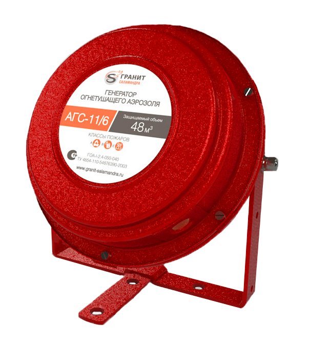 Выход аэрозоля по периметру 360°. АГС-11/6 представляет собой невысокий металлический корпус цилиндрической формы, на боковой поверхности которого по периметру находится сопловая щель. При своих малых габаритах генератор обеспечивает существенный защищаемый объем - до 48,0 м3.За счёт изменения конструкции системы значительно уменьшена массовая доля конденсированной фазы и снижена температура корпуса генератора. Имеет большое количество модификаций по типу крепления и направлению газо-аэрозольной струи.Принцип действия:При подаче электрического или теплового импульса на узел запуска, происходит воспламенение твердого аэрозолеобразующего заряда, продукты горения которого выходят в защищаемое помещение и тушат пожар.