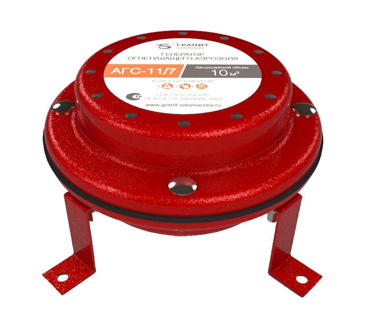 Генератор огнетушащего аэрозоля. Генератор огнетушащего аэрозоля универсальный с воздушным охлаждением; V-защ. 10.0 м.куб., t-раб. 25 сек., встроенный узел запуска, U-пуск. 12…13,6 В, I-пуск. ≥1.6 А, I-провер. ≤0,05 А; габ.размеры 98х214х214 мм, 2 кг. Установка на лапки.