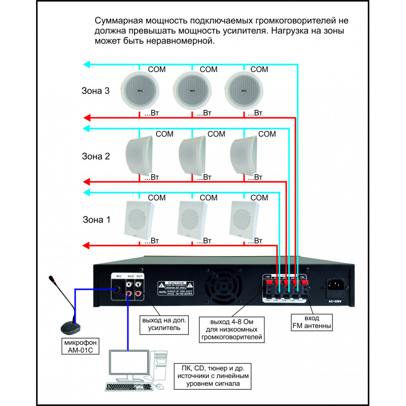 Микшер-усилитель. Трансляционный микшер-усилитель 120Вт, 100В, USB, FM тюнер, Bluetooth, 3 зоны трансляции; Независимая регулировка громкости в каждой зоне. Входы: 2 микрофонных (1-й приоритетный), 1 линейный. 220В 50 Гц .Возможность работы на нагрузку сопротивлением 4-16 Ом. 400x66x270 мм, 6,3 кг.