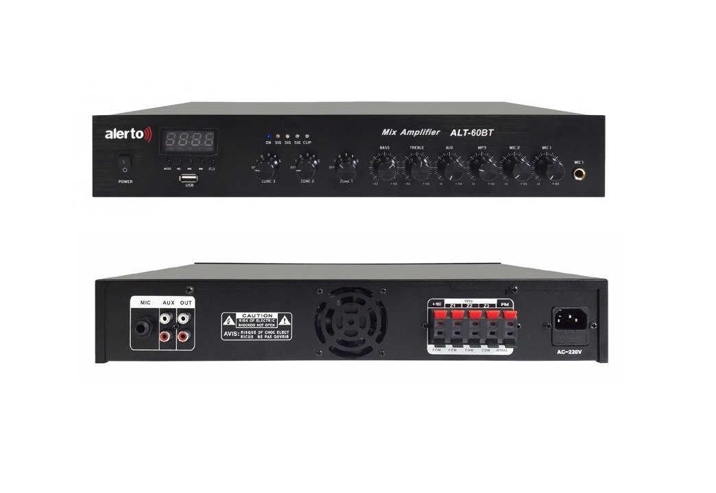 Микшер-усилитель. Трансляционный микшер-усилитель 60Вт, 100В, USB, FM тюнер, Bluetooth, 3 зоны трансляции; Независимая регулировка громкости в каждой зоне. Входы: 2 микрофонных (1-й приоритетный), 1 линейный. 220В 50 Гц .Возможность работы на нагрузку сопротивлением 4-16 Ом. 400x66x270 мм, 5,2 кг.