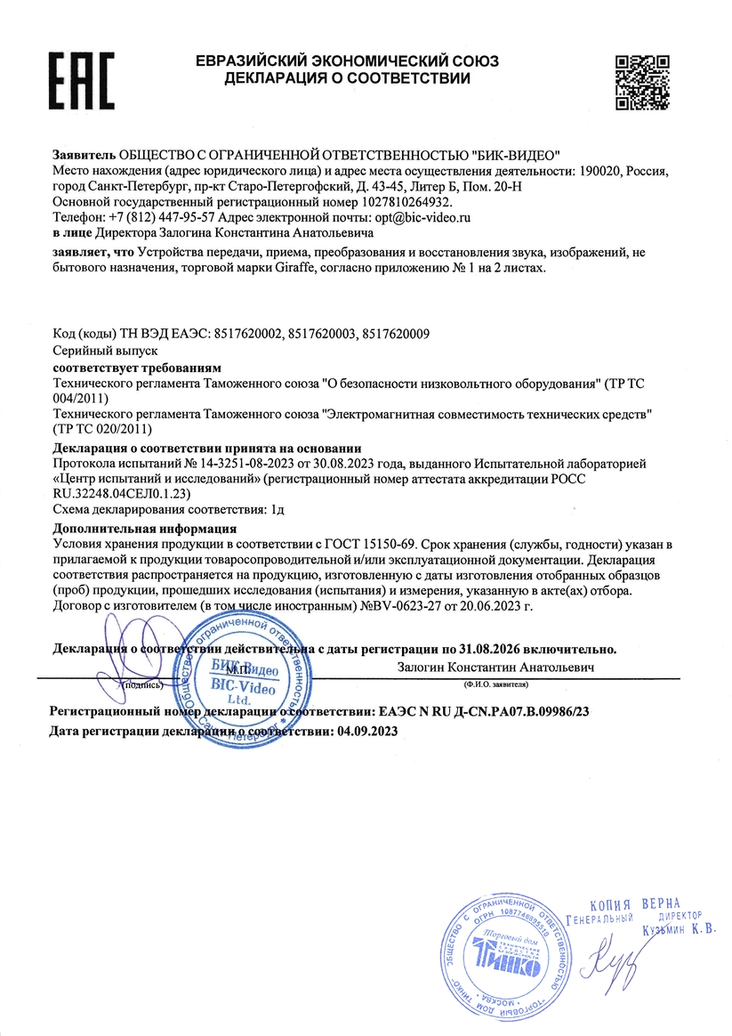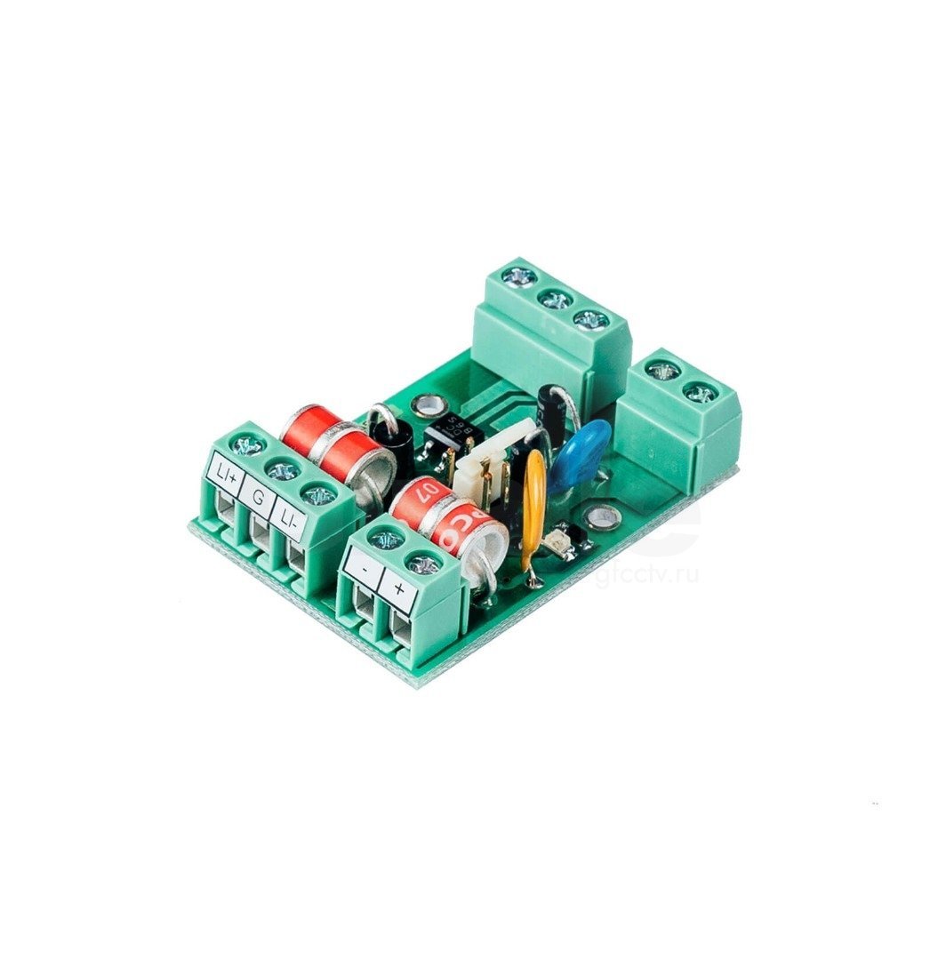 Устройство грозозащиты линии. Устройство для защиты протяженных несимметричных и симметричных линий передачи аналогового и цифрового сигнала и линии питания от наведенных напряжений, вызванных эл./магн. импульсами высоких энергий (грозовой разряд и т.п.). Линия питания имеет защиту от короткого замыкания и превышения пит. напряжения, макс. ток в цепи питания: 1А, напряжение ограничения: канала передачи видео/данные - 7.3В, питание - 12/24В (витая пара/коаксиальный кабель). Импульсный разрядный ток 8/10 мк/с - 10кА, потери в цепи передачи - 1дБ, -40...+50°С, 80х38х21 мм.