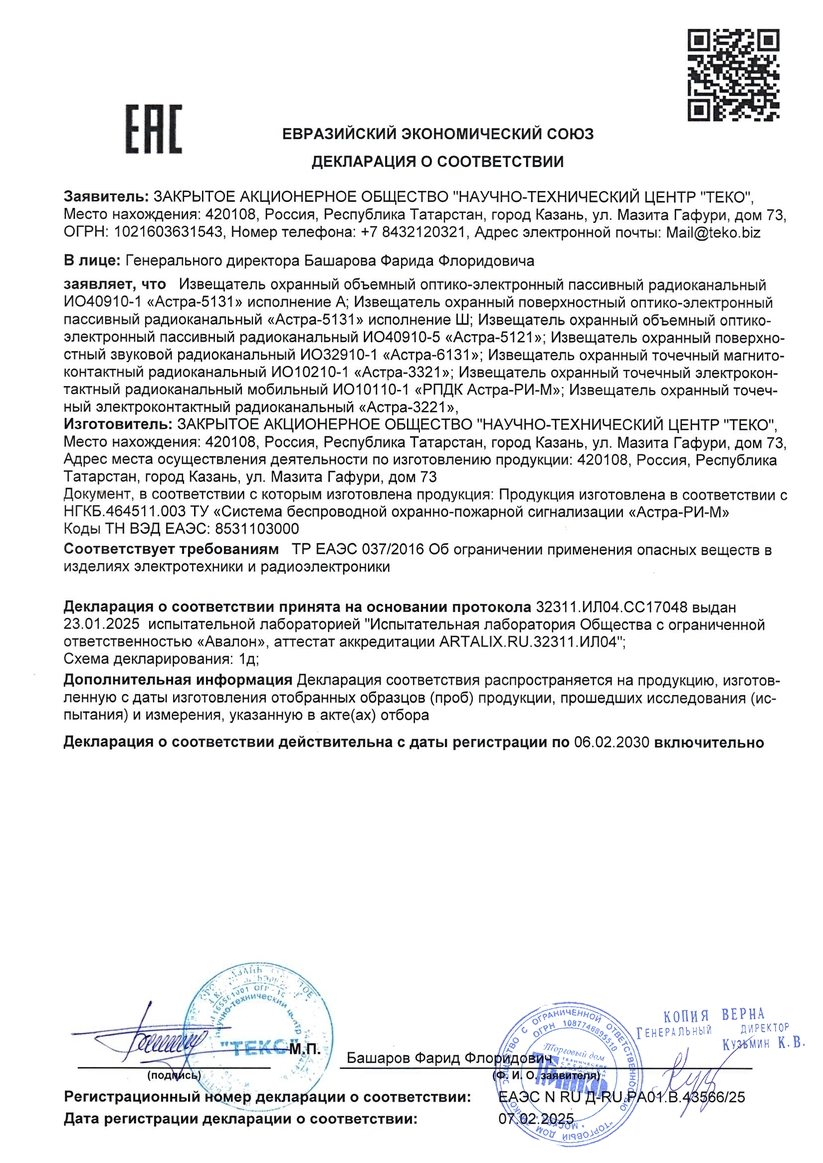 Предназначен для блокировки на открывание или перемещение конструкций, выполненных из магнитонепроводящих материалов и формирования извещения о тревоге путем дистанционной беспроводной передачи закодированных идентифицируемых сигналов на ретранслятор периферийный «РПУ Астра-РИ-М» устройства беспроводной охранно-пожарной сигнализации «Астра-РИ-М».