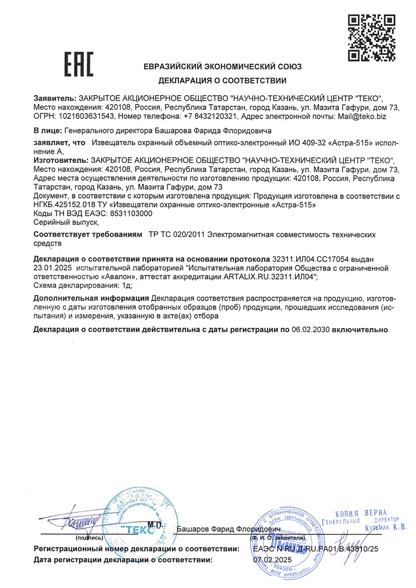 Извещатель охранный Астра-515 исп.А (ИО 409-32) предназначен для обнаружения проникновения в охраняемое пространство закрытого помещения и формирования извещения о тревоге путем размыкания выходных контактов сигнального реле; для работы в системе охранной сигнализации.