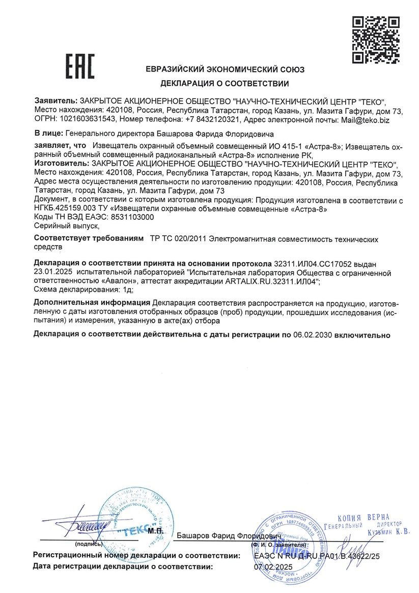 Извещатель охранный Астра-8 (ИО 415-1) предназначен- для обнаружения проникновения в охраняемое пространство закрытого помещения и формирования извещения о тревоге путем размыкания выходных контактов сигнального РЕЛЕ-ИК;- для обнаружения разрушения стекол остекленных конструкций закрытых помещений и формирования извещения о тревоге путем размыкания выходных контактов сигнального РЕЛЕ-АК.