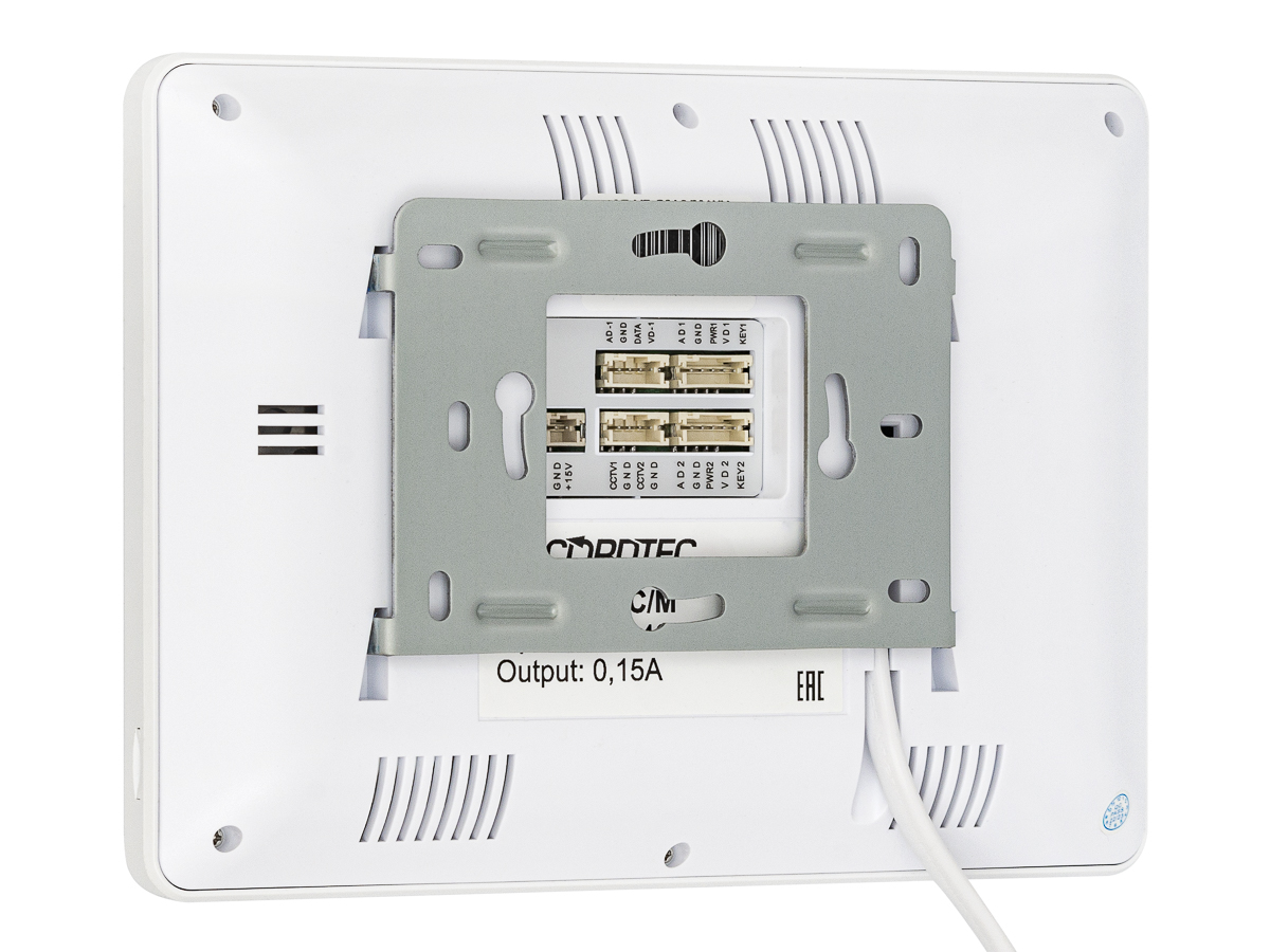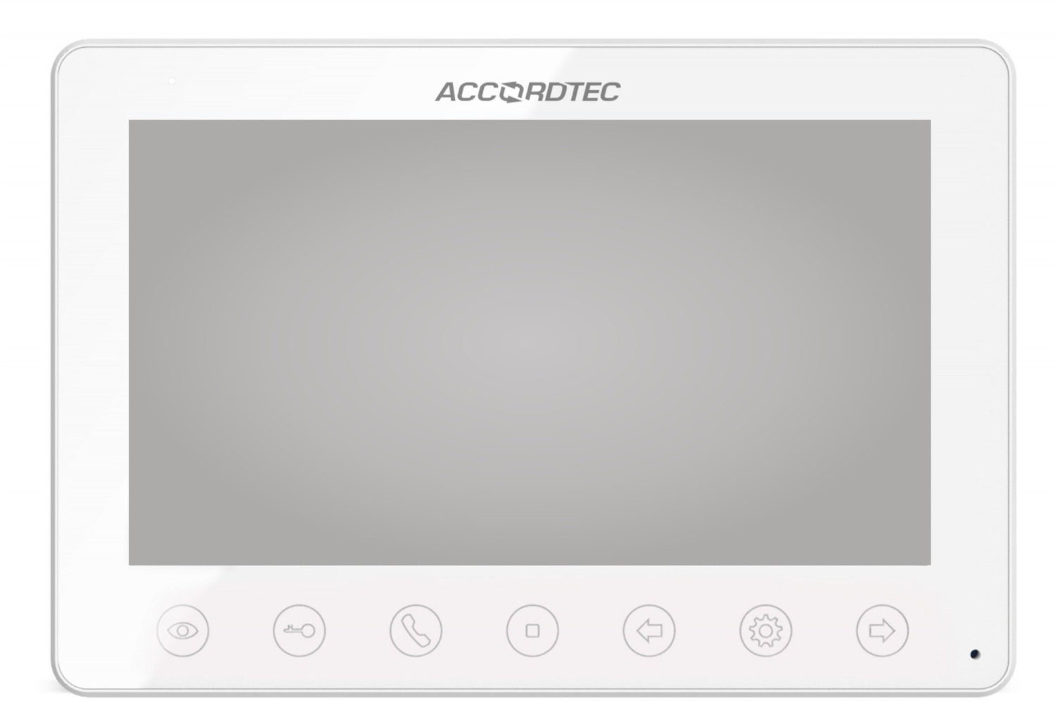Монитор домофона цветной с функцией «свободные руки». Монитор домофона 7" TFT (800х480) CVBS PAL/NTSC. Сенсорные кнопки, подключение до 2х вызывных панелей, 2х видеокамер, 4х мониторов, адресный интерком. Питание AC 100-240В. Габаритные размеры: 188х136х22 мм., 0...+40°C, Цвет корпуса белый.
