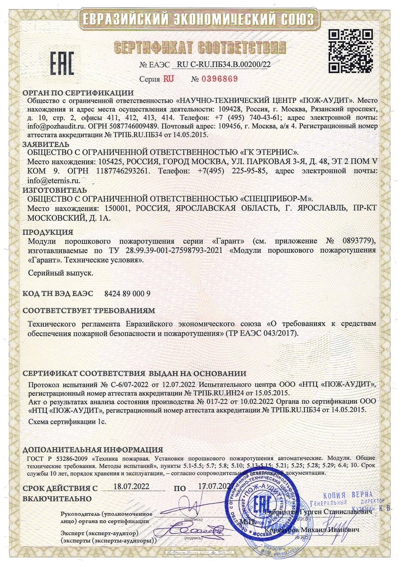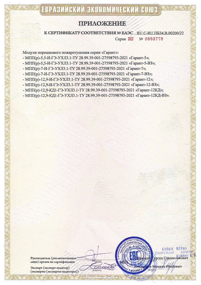 Модуль порошкового пожаротушения АУП «Гарант-Р». Модуль порошкового пожаротушения для тушения пожаров класса А,В,С; с принудительным запуском; высота установки 2…9 м; масса огнетушащего порошка (Вексон АВС-70) 10.8 кг; S-защищ. до 122 м² (класс. А); V-защищ. до 110 м.куб. (класс. А); U-пуск.24 В (max); I-пуск. не менее 100 мА; IP54; t-раб.-50...+50°C; DхВ 400х340 мм, вес 18.2 кг. Комплект: МПП «Гарант-12», блок «БОС», кронштейн.