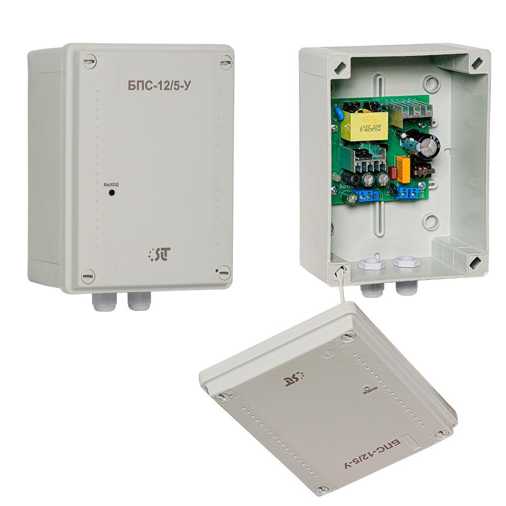 Блок питания стабилизированный. Источник питания стабилизированный уличный; U-вх.150…265 В, U-вых.11.0…14.0 В (регулировка), I-ном.5 А, U-пульс.50 мВ; защита от перегрузок по току и короткого замыкания, индикатор режимов работы, винтовые клеммники; IP56, t-раб.-25…+50°C, 185х124х84 мм. Пластиковый корпус