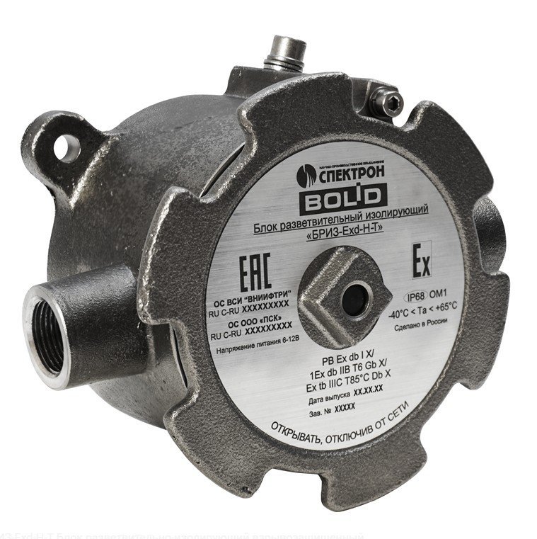 Блок разветвительно-изолирующий взрывозащищенный. Блок разветвительно-изолирующий взрывозащищённый (PВ Ex db I Mb/1Ex db IIC T6 Gb Ex tb IIIC T85°C Db) для изолирования короткозамкнутых участков ДПЛС с последующим автоматическим восстановлением после устранения короткого замыкания; питание по ДПЛС, I-деж. ≤200 мкА, I-сраб. 6 мА; климатическое исполнение ОМ1, IP68, t-раб. -40...+65°C, габ.размеры 140х77 мм, вес ≤2.7 кг, корпус из нерж.стали