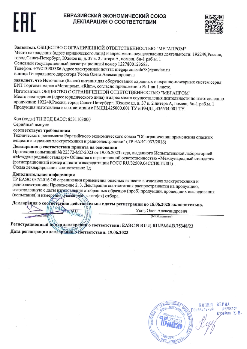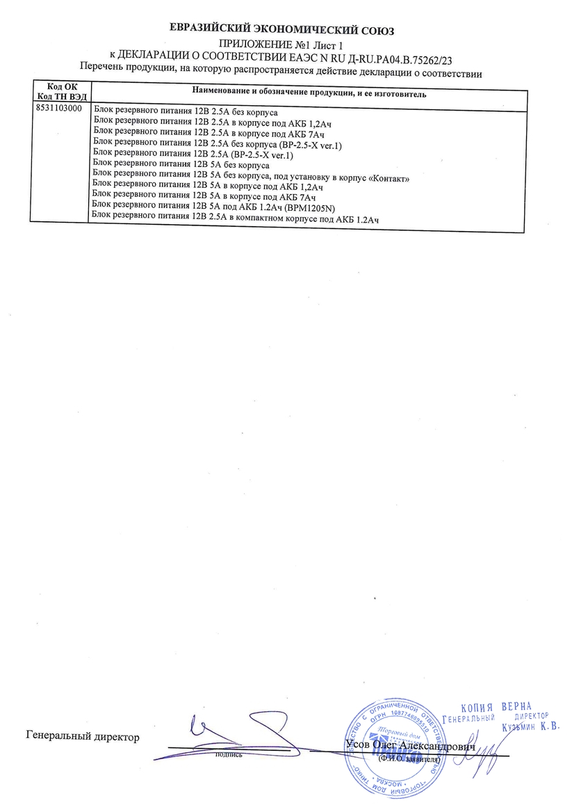 Блок резервного питания импульсный. Резервированный источник питания; U-вх.210…240 В, U-вых.12 В, I-вых.5 А, под АКБ 12 В 1.2 А·ч; встроенная защита от глубокого разряда аккумулятора, защита нагрузки от превышения выходного напряжения, контроль пропадания сети 220 В, защита аккумулятора от переполюсовки батареи и от превышения выходного напряжения; t-раб.-30…+35°С, 296х160 мм
