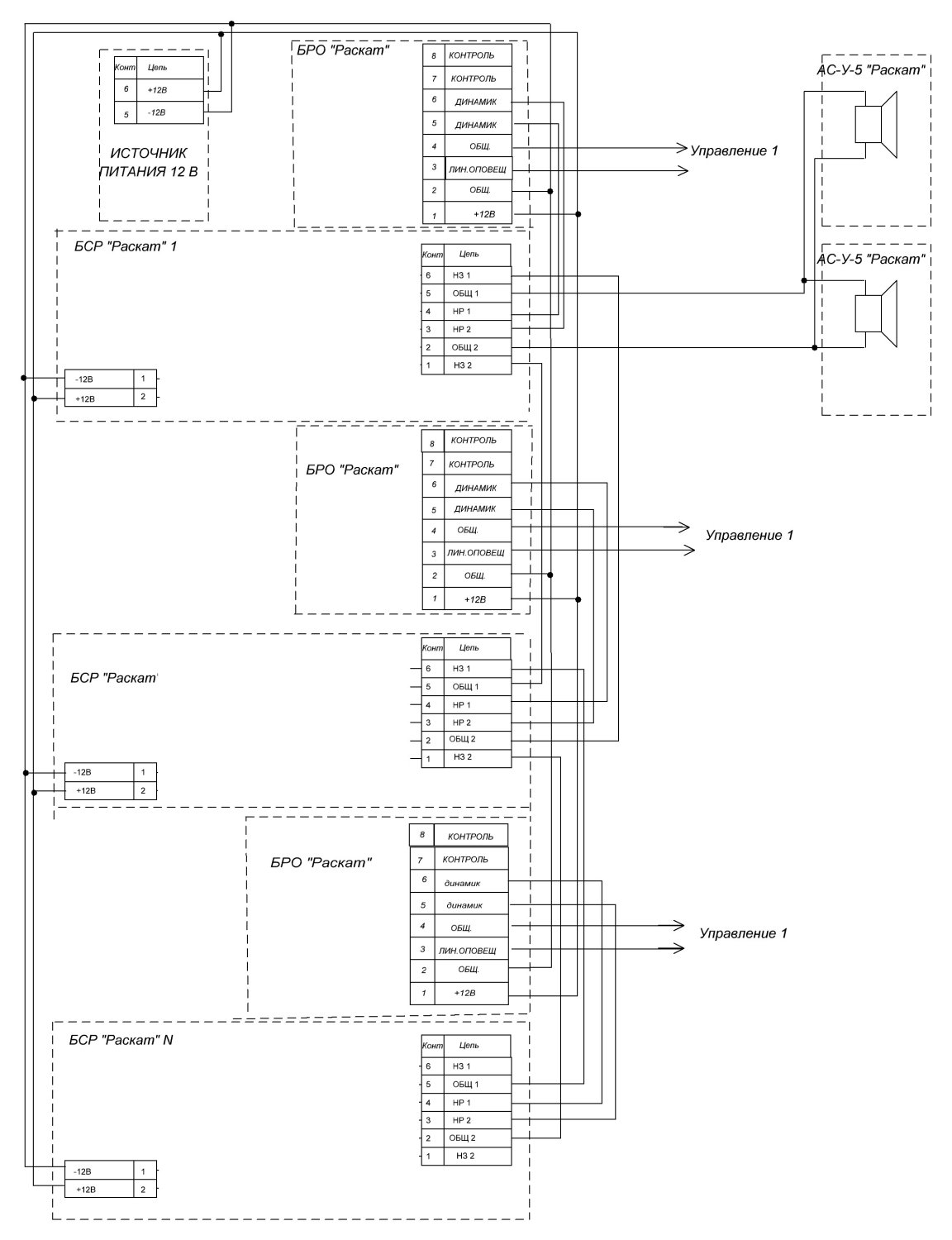 Блоки согласования «Раскат предназначены для работы совместно с устройствами речевого оповещения «Раскат» и позволяющие подключать к одной сети акустической (акустических) системы (систем) (АС-У-5) несколько блоков речевого оповещения «Раскат» (БРО), которые могут быть установлены в различных помещениях и имеющих различную записанную речевую информацию.