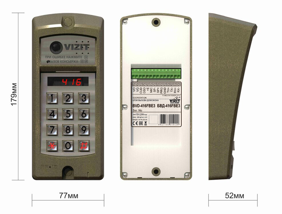 Блок вызова домофона. Блок вызова для совместной работы с БУД-430х, -482х, -485х. Встроенный считыватель ключей VIZIT-RF3 (поддержка RF7.1) RFID 13.56 МГц. Светодиодный дисплей. Встроенная IP-камера 4 Мп с подключением к Ethernet, ИК подсветка до 10 метров, угол обзора 90°. Корпус антивандальный. Накладной монтаж. -30...45°C; 77х179х52 мм. Цвет старая бронза.