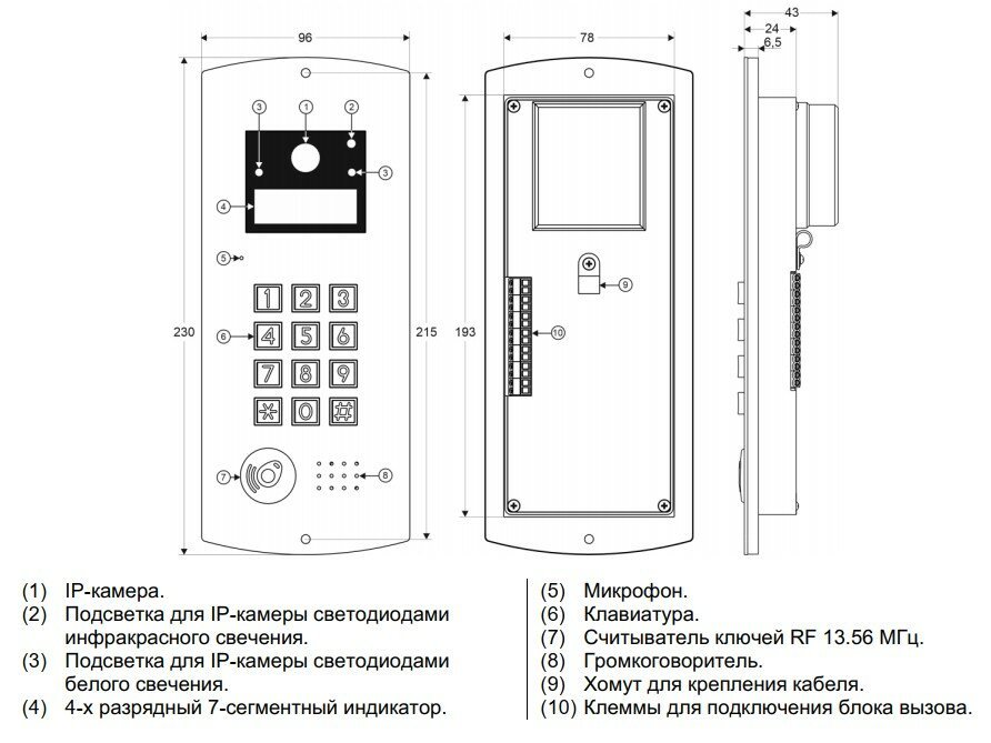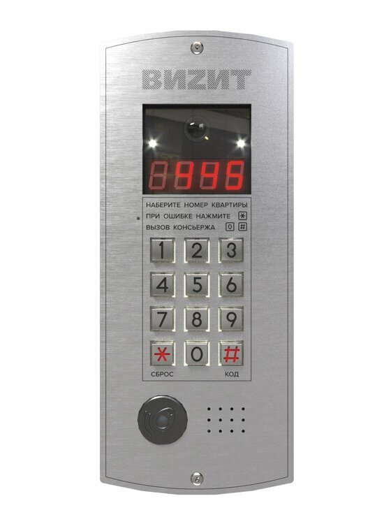 Блок вызова домофона. Блок вызова для совместной работы с БУД-430х, -485х. Встроенный считыватель ключей VIZIT-RF3 (поддержка RF7.1) RFID 13.56 МГц. Светодиодный дисплей. Встроенная IP-камера 4 Мп с подключением к Ethernet и композитный сигнал (CVBS), ИК подсветка до 10 метров, угол обзора 90°. Лицевая панель из нержавеющей стали. Врезной монтаж. -30°C...+45°C; 96х230х46 мм. Рекомендуется использовать совместно с монтажными комплектами МК-445, MKF-445.