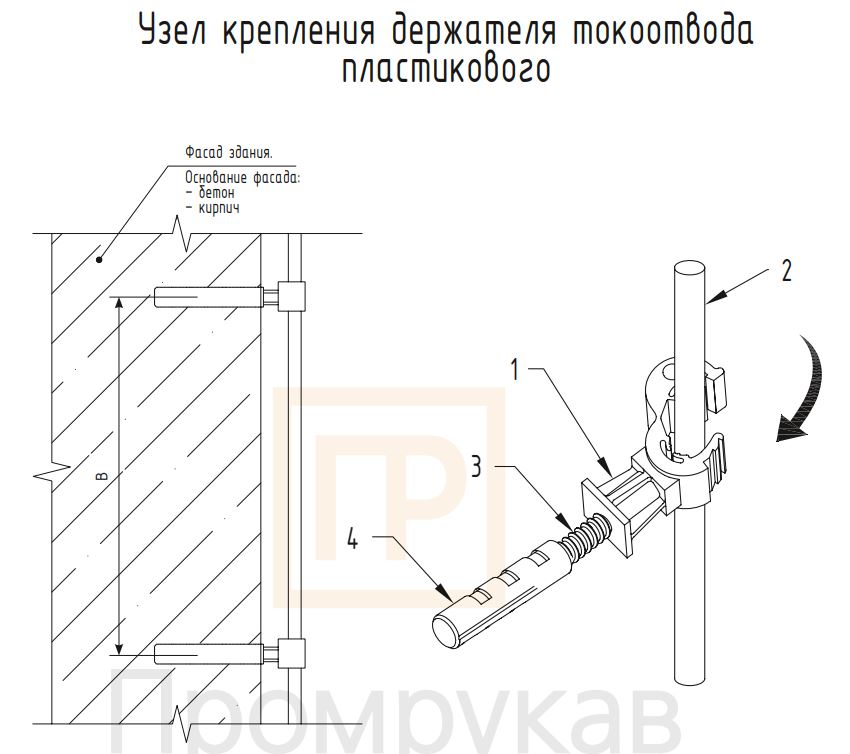 Держатель токоотвода пластиковый Промрукав предназначен для фиксации токоотвода d 8-10 мм к кровле, фасаду здания. Монтаж токоотвода осуществляется путем защелкивания держателя.