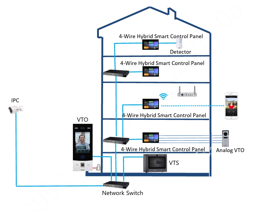 4х проводный гибридный монитор предназначен для работы: По 4х проводной линии с панелью DHI-VTO1000 С IP вызывными панелями.В рамках одноабонентской системы могут работать 20 вызывных панелей VTO и 10 мониторов VTHК многоабонентской вызывная панели в одной квартире может быть 5 мониторов VTH