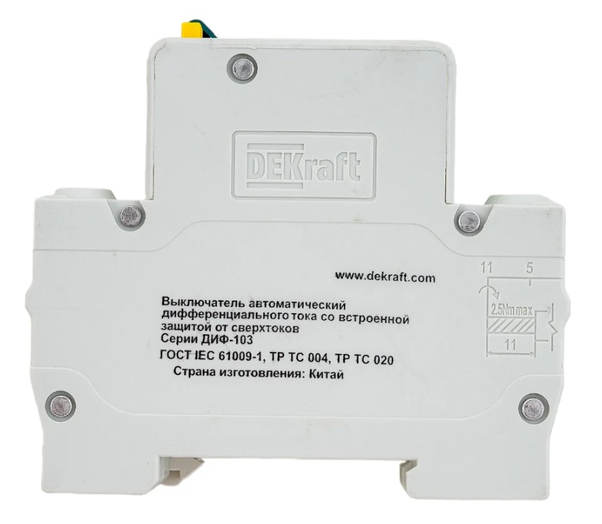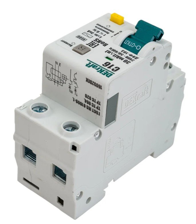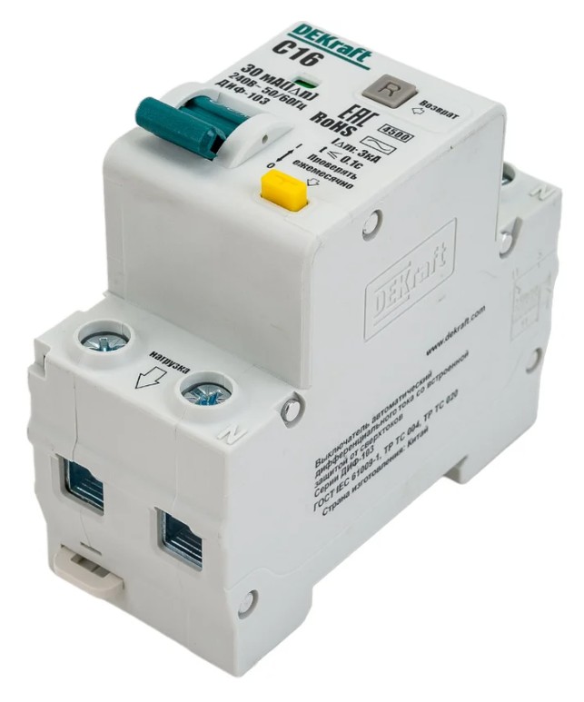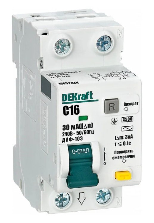 Автоматический выключатель дифференциального тока. Автоматический выключатель дифференциального тока (АВДТ) DEKraft ДИФ-103; два полюса 1Р+N, I-ном. 16 А, I-дифф. 30 мА, тип AC, хар-ка C, номин. отключающая способность 4,5 кА; IP20, t-раб. -25…+60°C, ширина 2 модуля