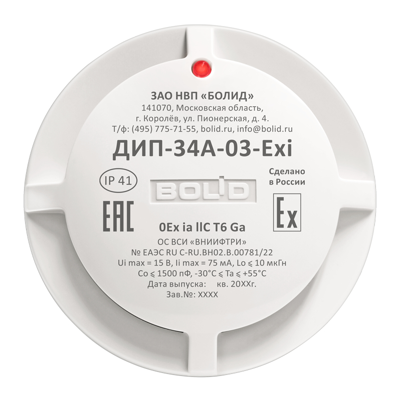 Извещатель пожарный дымовой оптико-электронный адресно-аналоговый взрывозащищенный ИП 212-34А «ДИП-34А-03-Exi» применяется в системах пожарной сигнализации и предназначен для обнаружения возгораний путём регистрации отражённого от частиц дыма оптического излучения и автоматического формирования сигнала о пожаре. Область применения: охрана различных закрытых помещений с взрывоопасными зонами класса 0 от пожара.
