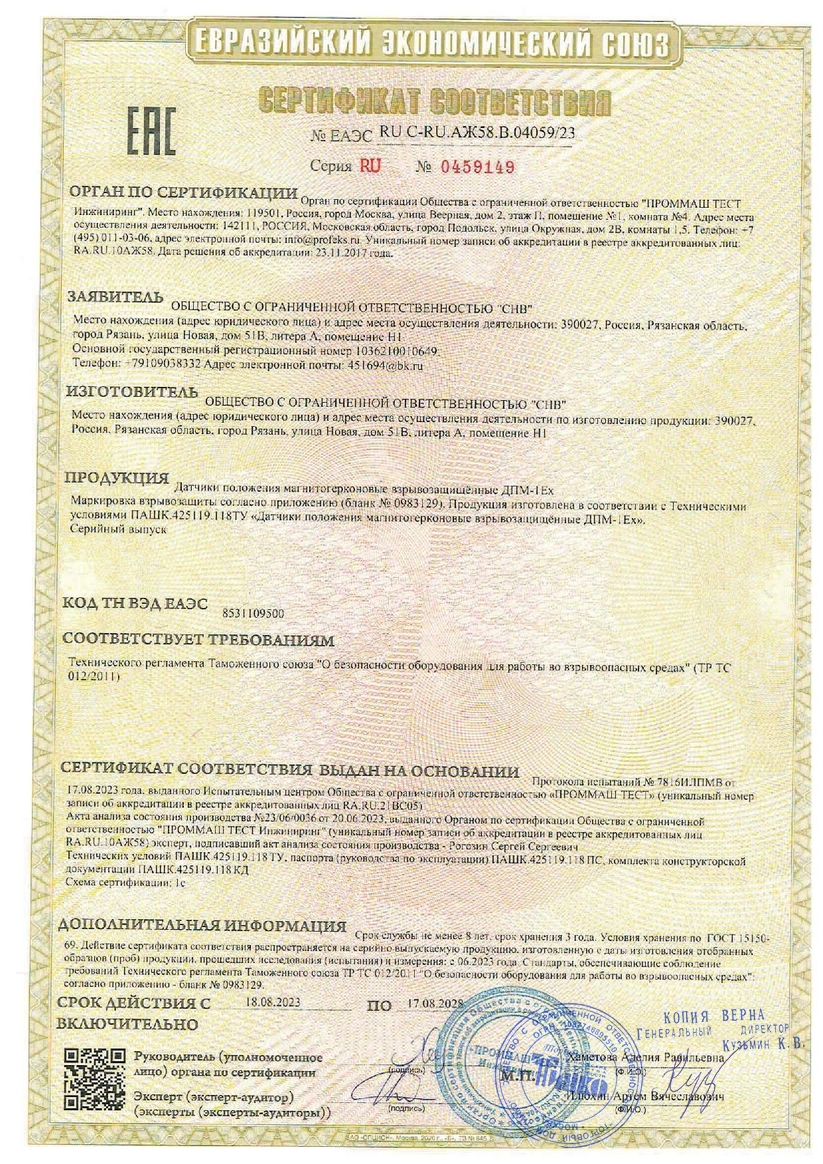 Датчик положения магнитогерконовый взрывозащищённый. Датчик положения магнитогерконовый взрывозащищённый 0Ex ia IIC T6 Ga Х/РО Ex ia I Ma Х; НР/НЗ, 10 мм и менее - контакты замкнуты, 20 мм и более - контакты разомкнуты;IP66/IP68, t-раб.-50…+50°С, 140х22х35 мм (блок геркона), 140х25х22 мм (блок магнита). Кабель 1 м в металлорукаве.