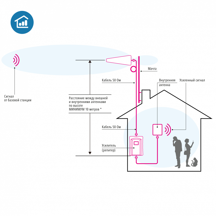 Комплект усиления сотовой связи. Комплект оборудования с репитером SMART мощностью 23 дБм (200 мВт) для усиления сигнала сотовой связи в стандартах 3G UMTS2100, 4G LTE2100, 4G LTE2600. Суммарное усиление комплекта до 90±2 дБ, DC 7В, 3А; 24Вт, 270х390х330 мм.