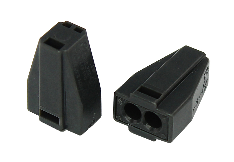 Клеммник для провода. Безвинтовая клемма 2-х проводная с токопроводящей пастой для соединения одножильных и многожильных проводов, сечением от 1,0 до 2,5 мм². Рабочее напряжение 250 В, ток 24 А. Рабочая температура: –45...+80 ºC