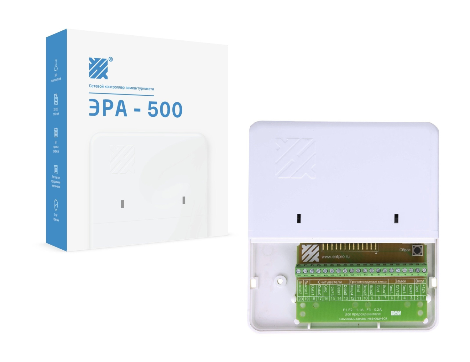 ● Все программное обеспечение ЭРА для контроллеров СКУД полностью бесплатное. Скачивается с сайта производителя!● Количество событий 30000, если 1 точка прохода и 15000, если 2 точки прохода;● Количество карт 500, если 1 точка прохода и 250, если 2 точки прохода;● Интерфейс связи контроллера со считывателями: - от Wiegand-4 до Wiegand-64, Touch Memory● Количество точек прохода: - 2 полноценные по интерфейсуTouch Memory; - 1 полноценная по интерфейсу Wiegand● Количество подключаемых считывателей - 4 (Touch Memory) или 2 (от Wiegand-4 до Wiegand-64)