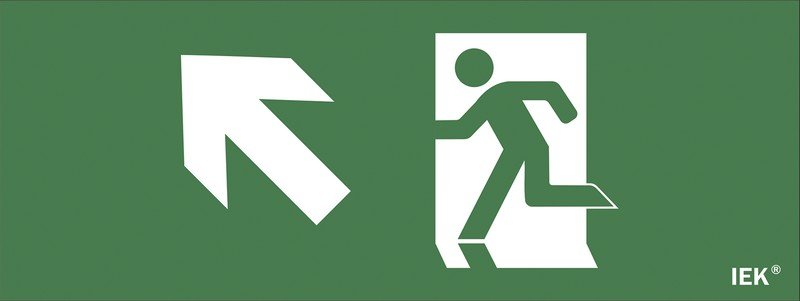 Этикетка самоклеящаяся. Самоклеящаяся этикетка "Фигура/стрелка вверх влево" для ДПА IP20/54, размер знака 240х90 мм, подходит для нанесения на аварийные светильники ДПА 2101, 2104, 2105, 5030, 5032, 5040, 5043, цвет зеленый