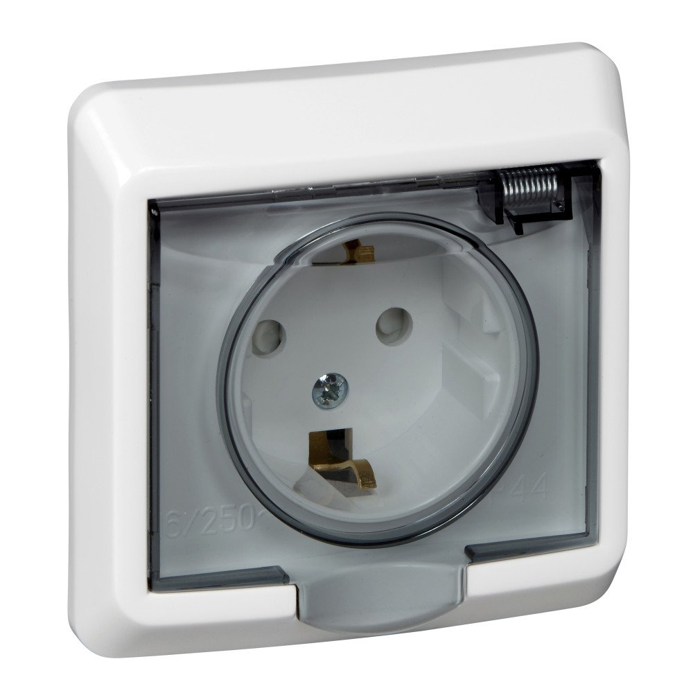 Этюд розетка 1-местная, в сборе, с заземлением со шторками с крышкой, скрытой установки, IP44, белый (PC16-044B)