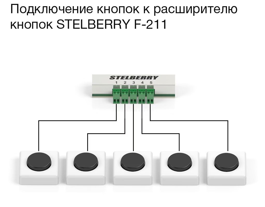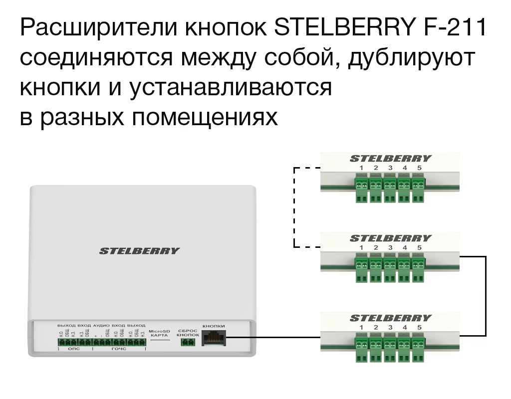 ● Удобное решение для масштабирования тревожных кнопок в разных помещениях● Максимальное расстояние от коммутатора STELBERRY F-200 до самого удалённого расширителя может составлять до 1000 метров.● Содержание сообщения могут быть согласованы на этапе регистрации проекта.● Количество подключенных в систему расширителей не ограничено.● При нажатии на одну из пяти кнопок начинает транслироваться сообщение с соответствующим номером.● Удобные отстёгивающиеся винтовые разъёмы● Металлический корпус● Удобное крепление при помощи двустороннего скотча, уже наклеенного снизу расширителя STELBERRY F-211