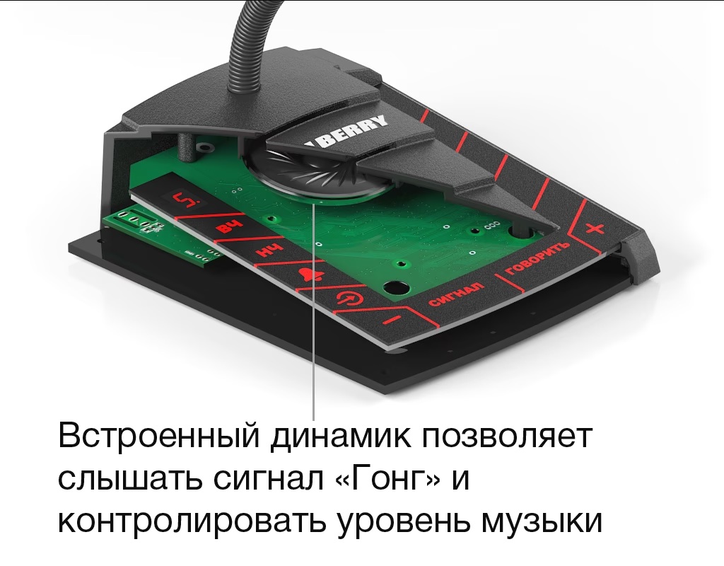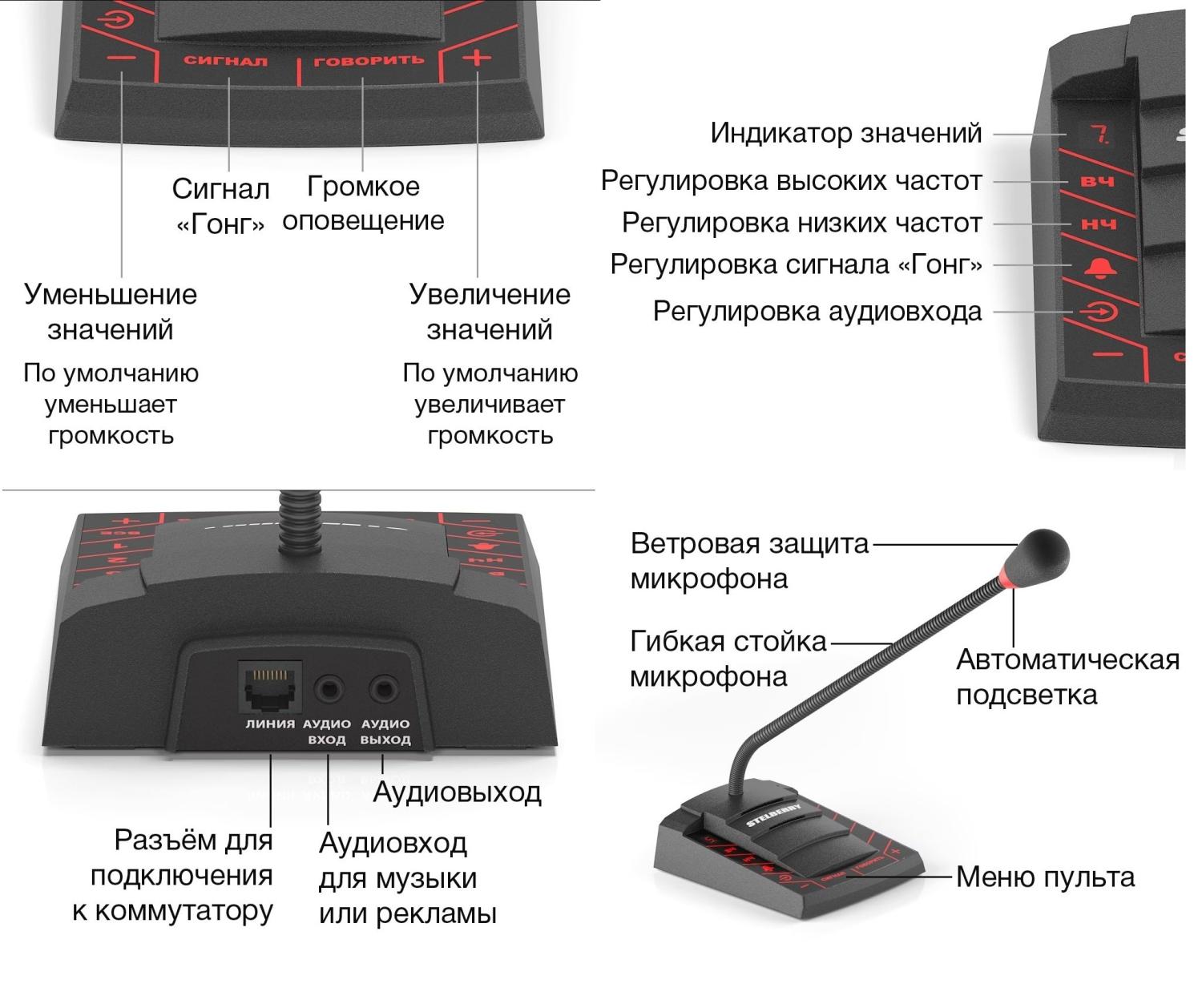 ● Также, пульт оснащён полифоническим сигналом привлечения внимания «Гонг».● Пульт снабжён регулировками громкости, высоких и низких частот, а также позволяет отрегулировать громкость фоновой музыки и сигнала «Гонг».● Направленный HD-микрофон● Аудиовход для внешнего источника (музыкальная трансляция)● Аудиовыход для записи сообщений на IP-камеру, аудиорегистратор, видеорегистратор● Цифровая обработка и фильтрация звука с микрофона и аудиовхода● Полифонический сигнал привлечения внимания «Гонг»● Регулировка громкости сигнала «Гонг»● Регулировка НЧ и ВЧ частот● Индикатор значений● Ветровая защита микрофона● Меню с подсветкой
