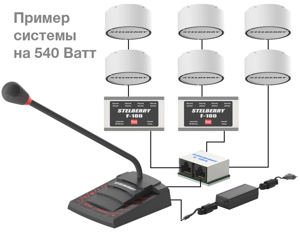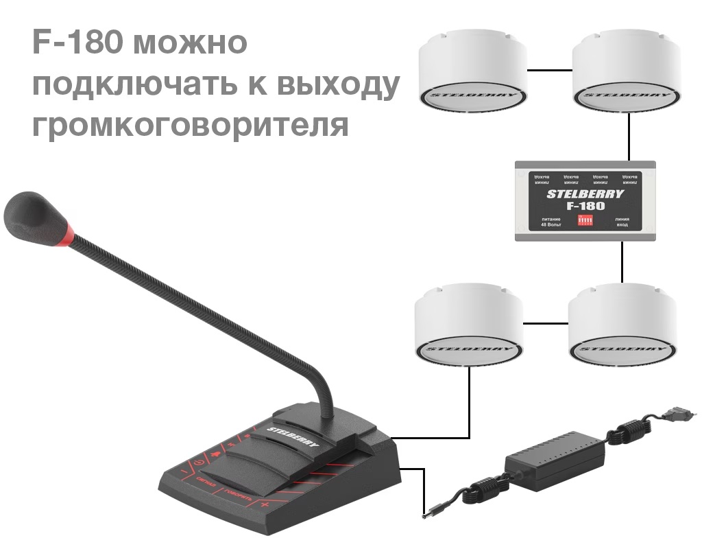 Пульт микрофонный 4 зоны. Пульт громкого оповещения Stelberry F-742; 180 Ватт; 4 зоны; +10...+50°C; габаритные размеры: 120х140х40 мм; 0,3 кг; однонаправленный кардиоидный микрофон в гибкой стойке пульта; аудиовход jack 3,5mm для внешнего источника звука (музыки); аудиовыход jack 3,5mm для записи сообщений на IP камеру, видеорегистратор, аудиорегистратор; в комплекте: пульт, коммутатор на 4 зоны, источник питания на 48 Вольт.