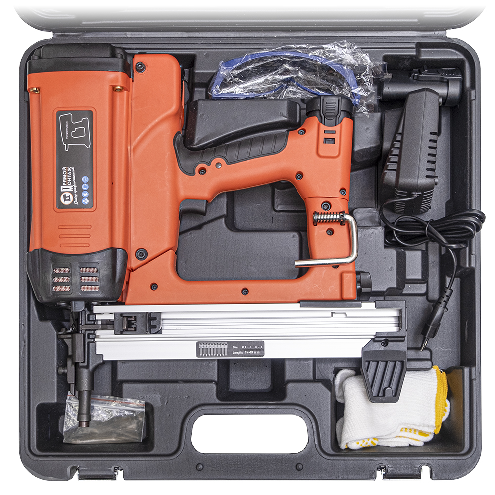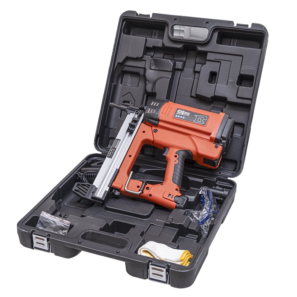 Газовый монтажный гвоздезабивной пистолет 90Дж 7,2В. Пистолет газовый монтажный под гвозди по бетону, металлу, кирпичу 15…40 мм; ёмкость магазина 30 гвоздей, энергия выстрела 90 Дж; АКБ 7.2 В 2 Ач (2 шт.), t-раб.-5…+50°C, габ.размеры 385х115х375 мм, вес 3,7 кг (с АКБ), 7,6 кг (комплект с кейсом).