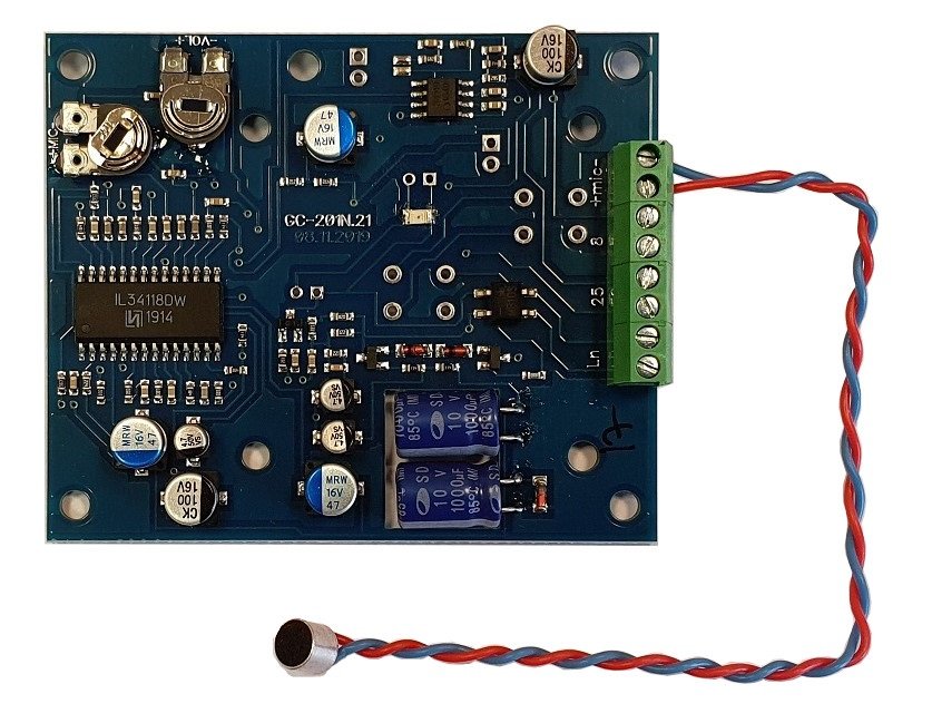Абонентский комплект громкой связи. Абонентский комплект громкой связи GC-2001N2 без корпуса, без громкоговорителя, работает с пультами GC-1001D4, GC-1006D, GC-1009D, GC-3006DG, серии GC-1036F. Абонентский комплект громкой связи GC-2001N2 обеспечивает: - режим громкой дуплексной связи; - автоматическое включение / выключение с диспетчерского пульта; - ручное включение с помощью кнопки. Питание осуществляется от диспетчерского пульта.