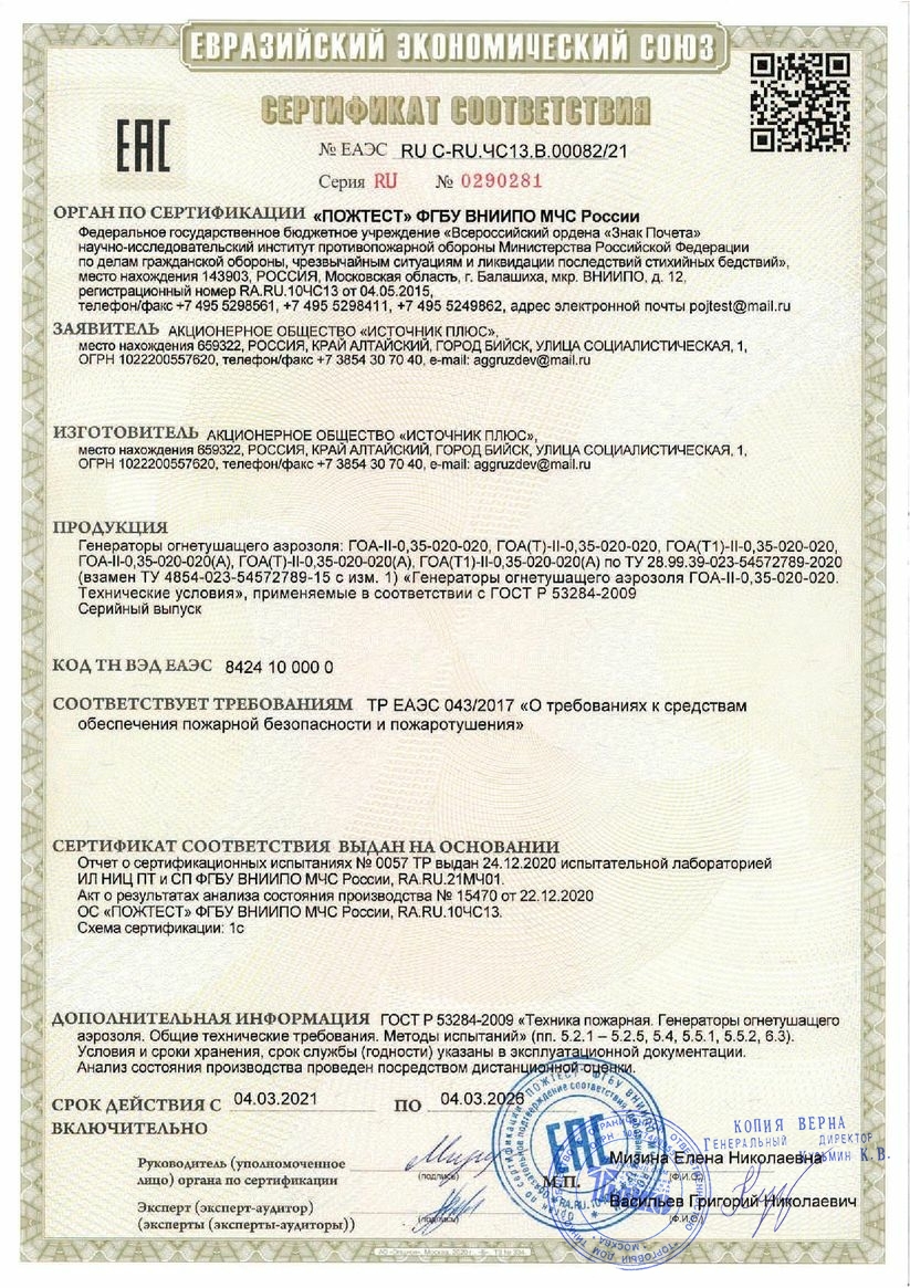 Генератор огнетушащего аэрозоля. Генератор огнетушащего аэрозоля транспортного исполнения для объемного тушения пожаров подкласса А2, классов В и Е (электроустановок находящихся под напряжением до 1000 В), а также локализации пожаров подкласса А1, V-защ. max 17.5 м³, время выпуска ОТВ 20±2 сек., I-пуск. 200 мА, R-цепи пуска 8…16 Ом, t-раб.-50…+50°С; габ.размеры (ВхДхШ) 123х317х103 мм, вес 2.2 кг.