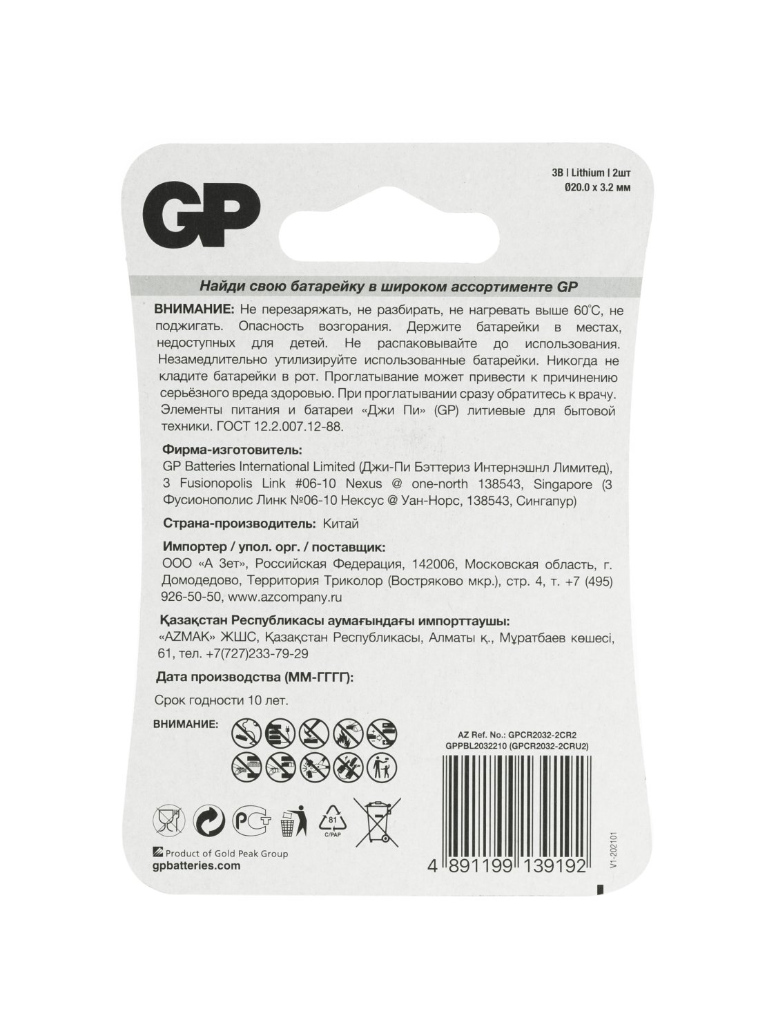GP Lithium CR2032 (GP CR2032-2CRU2), упак. 2 шт. БЛИСТЕР