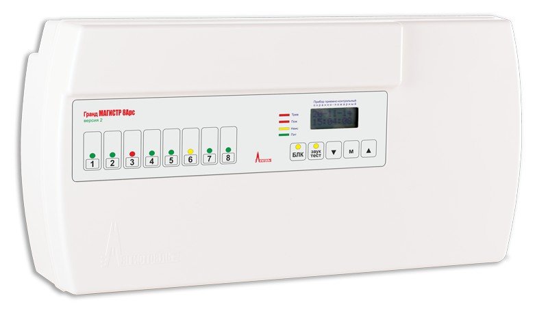 Прибор приемно-контрольный охранно-пожарный. ППКОП; 8 ШС; встроенная клавиатура для управления и программирования; ЖК-дисплей; регистратор на 1024 события; возможность установки SMS модуля; 3 выхода ПЦН; 3 контролируемых выхода "ОК"; порт ТМ; U-пит.130...280 В; под АКБ 12 В/7 Ач; I-потр.210 мА; вход внешнего РИП 12 В; выход питания внешней нагрузки 12 В/1 А; t-раб.+5...+50°C, 322х167х89 мм