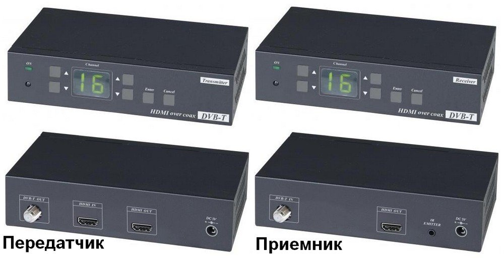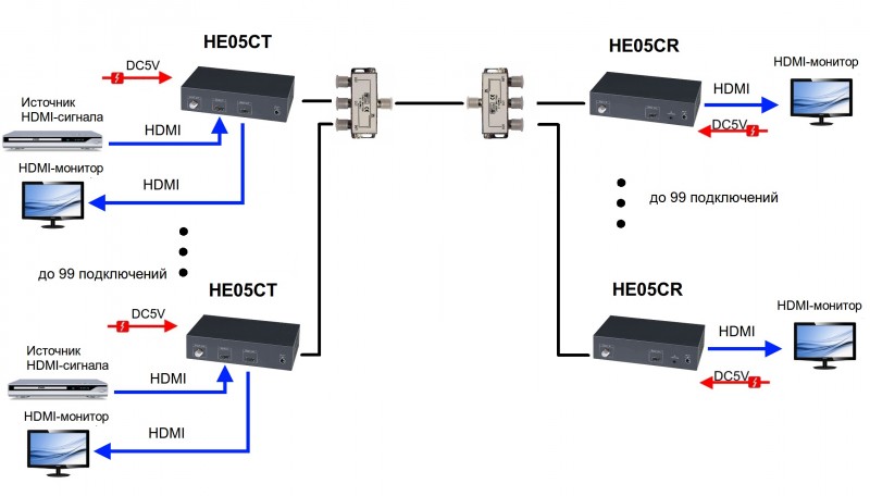 Удлинитель HDMI-сигнала. Комплект (передатчик HE05CT + приёмник HE05CR) для передачи HDMI сигнала по коаксиальному кабелю; Расстояние передачи до 500м с коаксиальным кабелем RG59/RG6(1080p/30Гц); Поддержка до 99 каналов с частотным диапазоном 142-950МГц; Режим работы точка-точка, мультиточка-мультиточка и точка-мультиточка для подключения до 99 приемников HE05CR; Передатчик вх./вых.- HDMI(A), DC5В, вых.- F-коннектор. Приёмник вх.- F-коннектор/DC5В/IR, вых.- HDMI(A); DC5В /750мА (БП 2 шт в комплекте); 0°...+70°C; 167x40x110,5мм