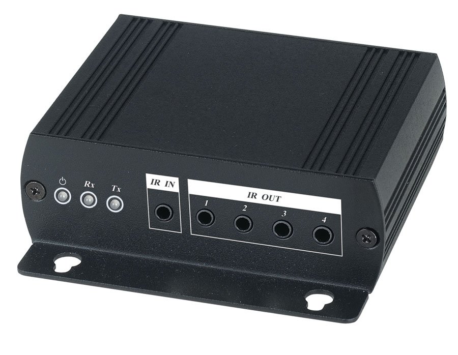 Приемопередатчик ИК-сигнала. Комплект для передачи сигнала ИК управления по одному кабелю витой пары CAT5 (и выше) на расстояние до 1200м; Поддерживает двунаправленную передачу; Два приёмопередатчика: 1 ИК вход + 4 ИК выхода, 1 порт RJ-45; DC12В /500мА (БП в комплекте)можно использовать как с приёмником, так и с передатчиком)); -40°...+55°C; 95х30х88мм