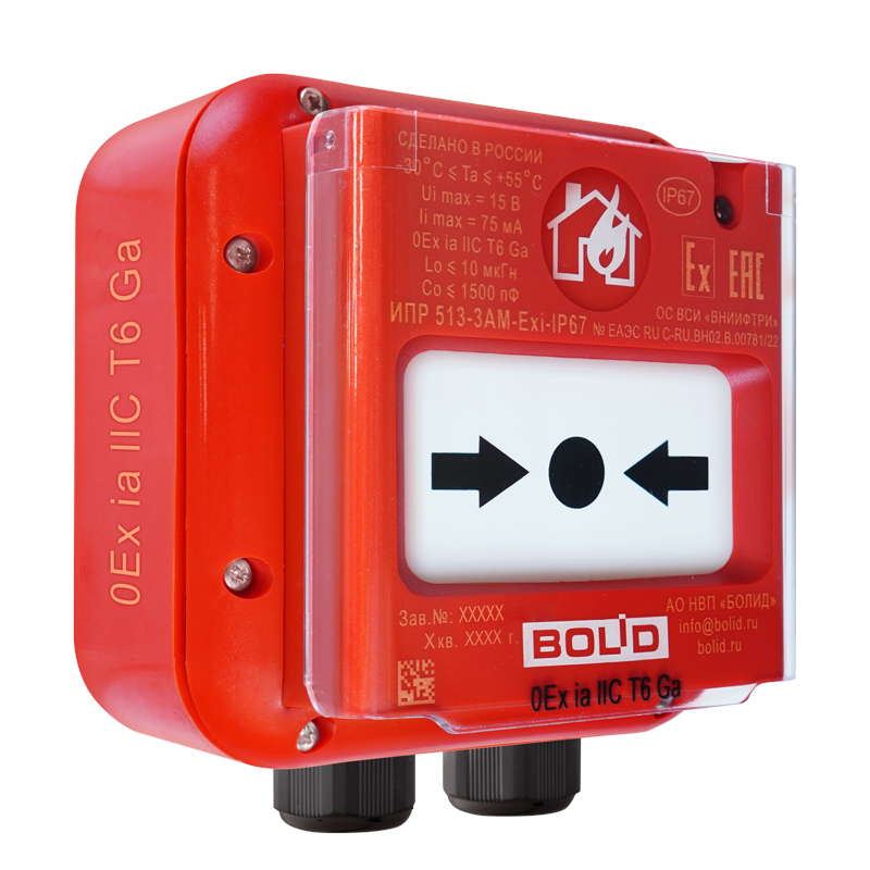 Извещатель пожарный ручной адресный взрывозащищённый «ИПР 513-3АМ-Exi-IP67» применяется в системах пожарной сигнализации и предназначен для ручного формирования сигнала пожарной тревоги.ИПР работает с контроллерами двухпроводной линии связи «С2000-КДЛ», «С2000-КДЛ-2И», «С2000-КДЛ-2И исп.01», «С2000-КДЛ-С» в составе интегрированной системы охраны «Орион», во взрывоопасных средах II группы и пожароопасных помещениях.