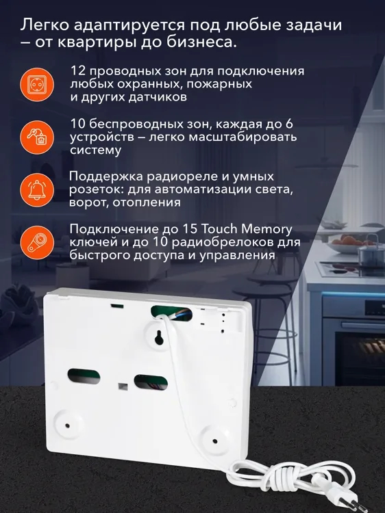GSM Wi-Fi сигнализация. Прибор приемно-контрольный с GSM и Wi-Fi коммуникаторами, 2 SIM (2G); 12 проводных ШС, 10 беспроводных ШС (до 6 извещателей на одну зону); встроенный датчик температуры; до 10 беспроводных пультов; один релейный выход НЗ/НР, U-коммут.220 В, I-коммут.10 А; до 10 беспроводных выходов; вход TouchMemory; до 5 номеров оповещения; miscroUSB; U-пит.220 В, под АКБ 12 В 2.2Ач ; IP20, t-раб.-30…+55°C, 197х164х60 мм. В комплекте SIM-карта МТС.