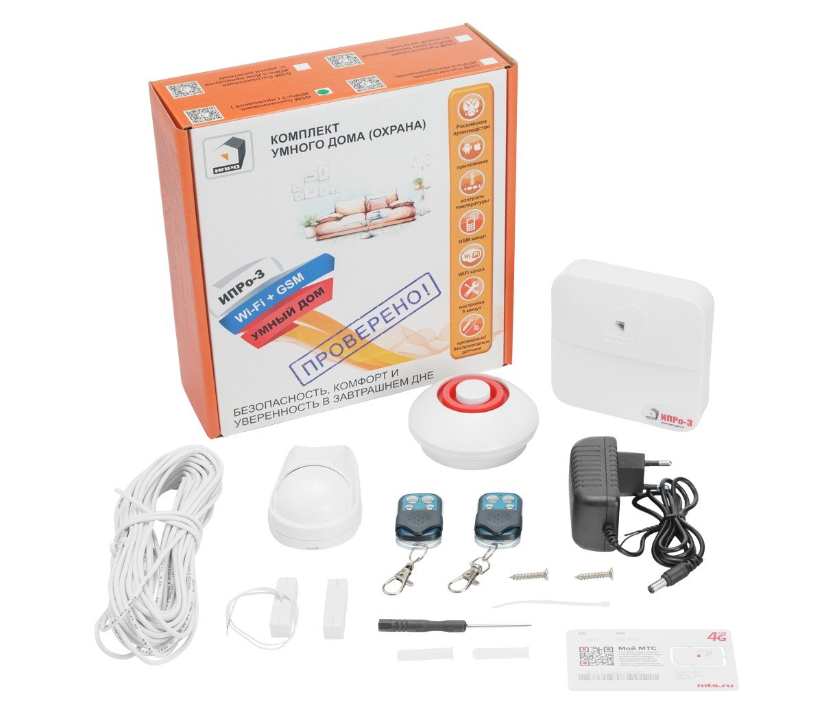 GSM сигнализация. Комплект для охраны имущества. Состав: GSM WI-FI контроллер "ИПРо 3" - 1 шт., проводной ИК-датчик движения - 1 шт., проводной датчик открытия двери - 1 шт, радиобрелок - 2 шт, проводная сирена - 1 шт., блок питания 12 в - 1 шт, АКБ CR14500 800 мА*ч, 3.7 В - 1 шт.