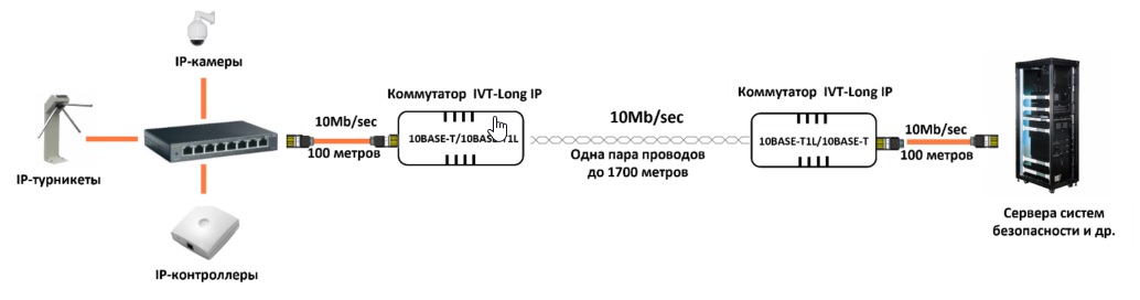 Удлинитель Ethernet. Удлинитель Ethernet по одной паре проводов до 1700 метров (комплект). Предназначен для передачи данных Ethernet по любым двум проводам, в т.ч. по любому коаксиальному кабелю, телефонной паре, двум ТПП или UTP проводам. Скорость передачи данных - фиксированная 10Mb/s Full Duplex, расстояние передачи зависит от толщины проводников и составляет 1700 метров для пары проводов с диаметром 1,63 мм. (14AWG) и 1000 метров для пары проводов с диаметром 0.511 мм. (24AWG). Возможно последовательное подключение 512 удлинителей.Встроенная защита от помех на линии.Порты: подключение к линии - однопарный клеммный разъем, подключение к LAN - разъем RJ-45. Питание - клеммный разъем, DC 12В, потребляемая мощность 0,5Вт; 90х65х30 мм; -40…+85°C.