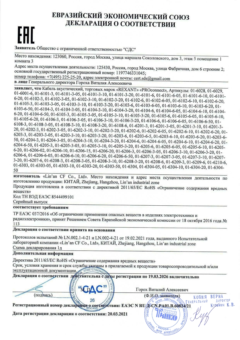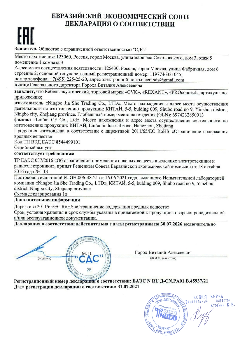 Кабель. Акустический кабель 2х0,35 мм²; многопроволочные проводники (омеднённый алюминий) в изоляции из поливинилхлоридного пластиката красного и черного цвета.