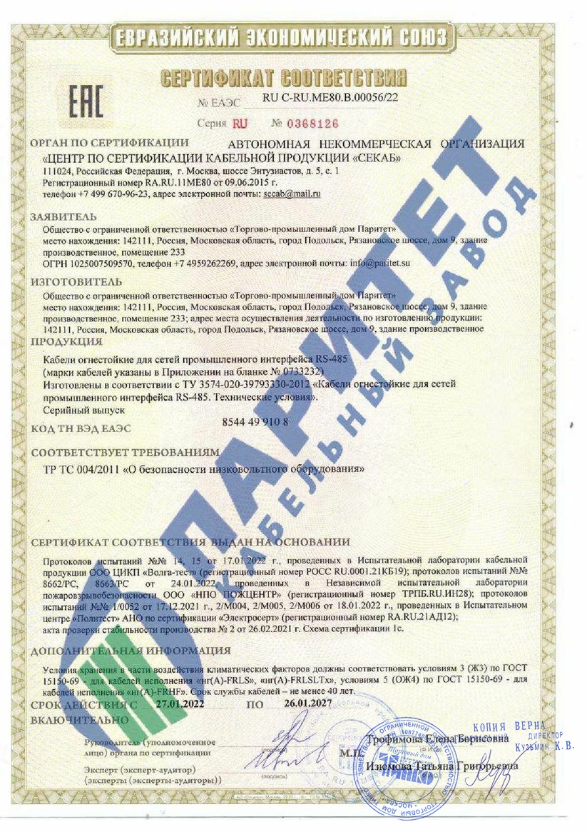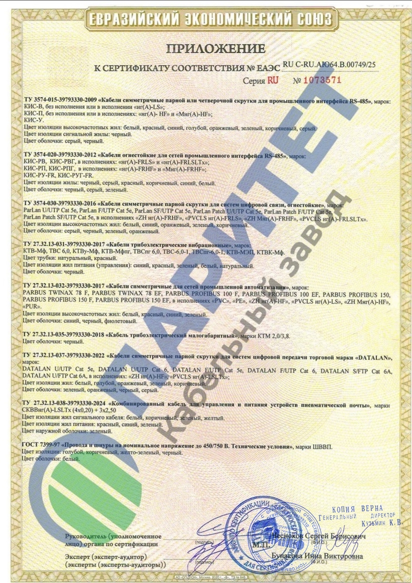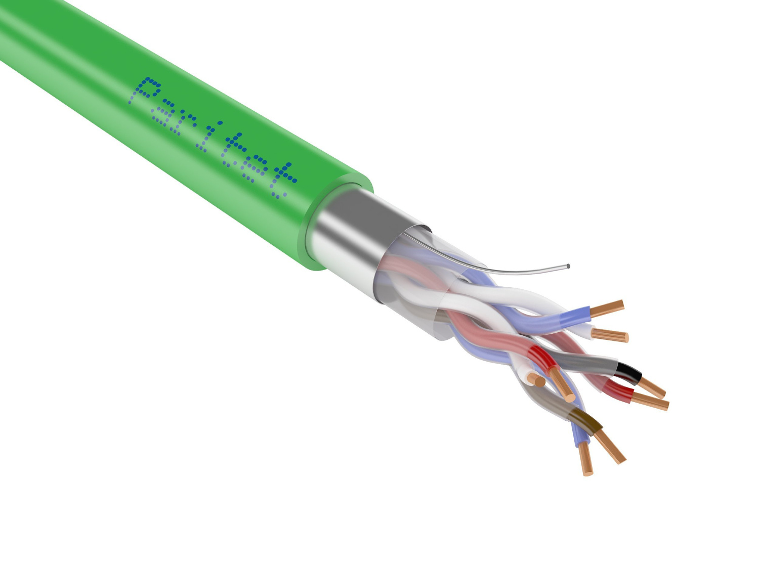 Кабели для промышленного интерфейса. Кабель интерфейсный парной скрутки для RS-485 (ModBus, CANbus); медная однопроволочная жила в комбинированной изоляции (кремнийорганический и полиолефиновый слои), D-жил.1.13 мм, S-жил.1 мм², D-каб.19.7 мм; в экране из алюмополимерной ленты; в оболочке из низкотоксичного ПВХ пластиката пониженной пожарной опасности с низким дымо- и газовыделением. Зелёного цвета.