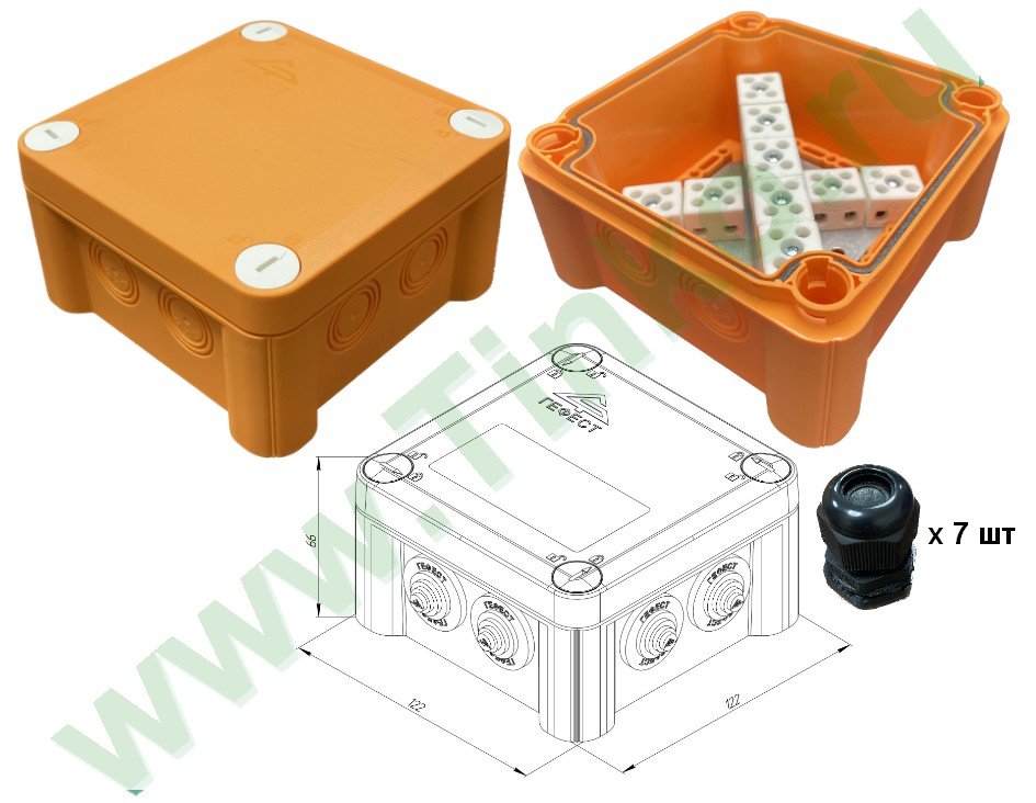 Коробка монтажная огнестойкая. Коробка монтажная огнестойкая, пластиковая, стойкая к УФ; 7 пластиковых каб.вводов под кабель Ø6…12 мм (устанавливаются самостоятельно в удаляемые профили), керамический клеммник на 18 полюсов, сечение подключаемых проводов ≤3 мм²; У1, IP66, t-раб. -40…+80°С, габ.размеры 122х122х66 мм , цвет оранжевый.